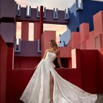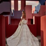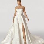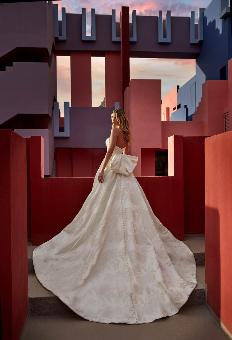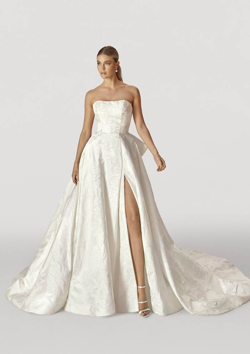The Gillian ballgown is composed of textured floral jacquard satin and finished with a bow along the back.